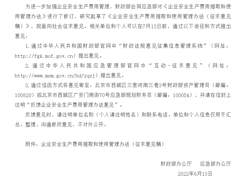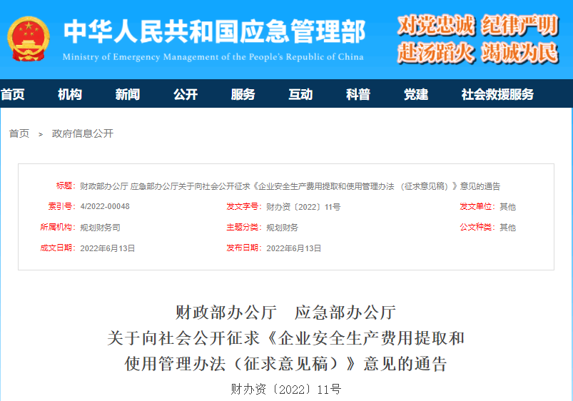 剛剛,應(yīng)急管理部又重新發(fā)布征求意見稿,這意味著新修訂的《企業(yè)安全生產(chǎn)費(fèi)用提取和使用管理辦法》將很快實(shí)施生效。2022年企業(yè)安全生產(chǎn)費(fèi)用的提取和使用將迎來大變動。